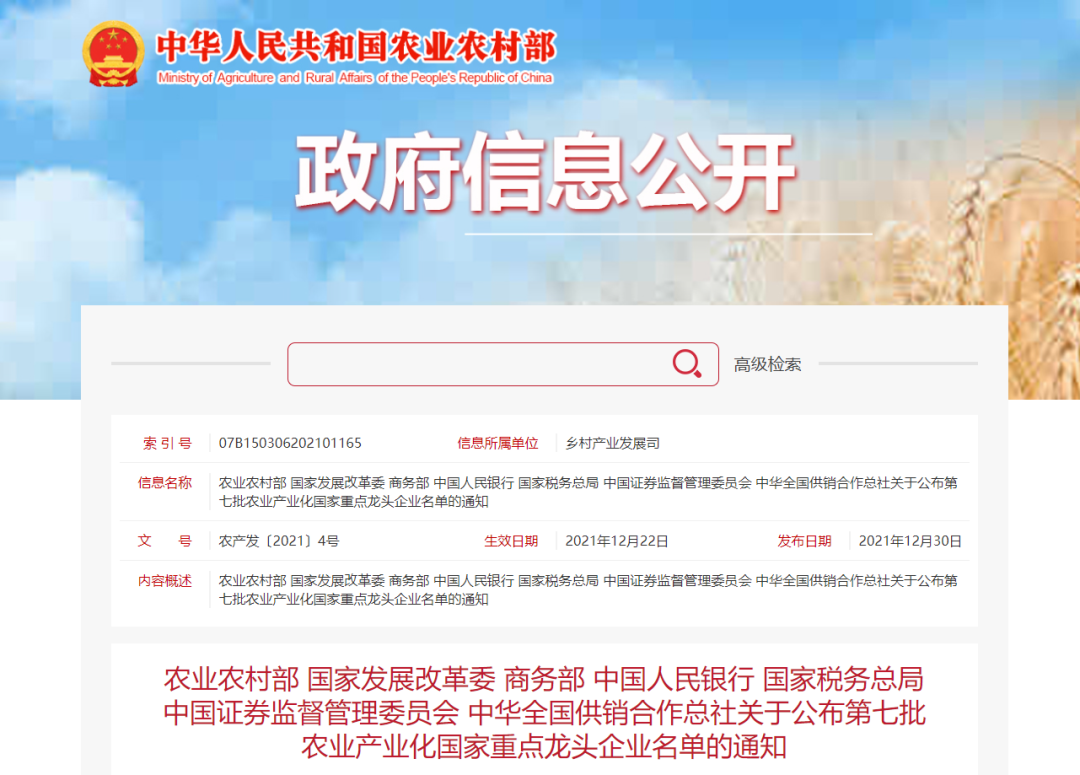 入選第七批農(nóng)業(yè)產(chǎn)業(yè)化國家重點(diǎn)龍頭企業(yè)